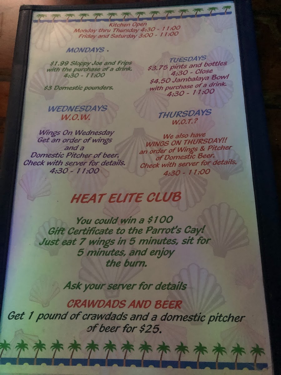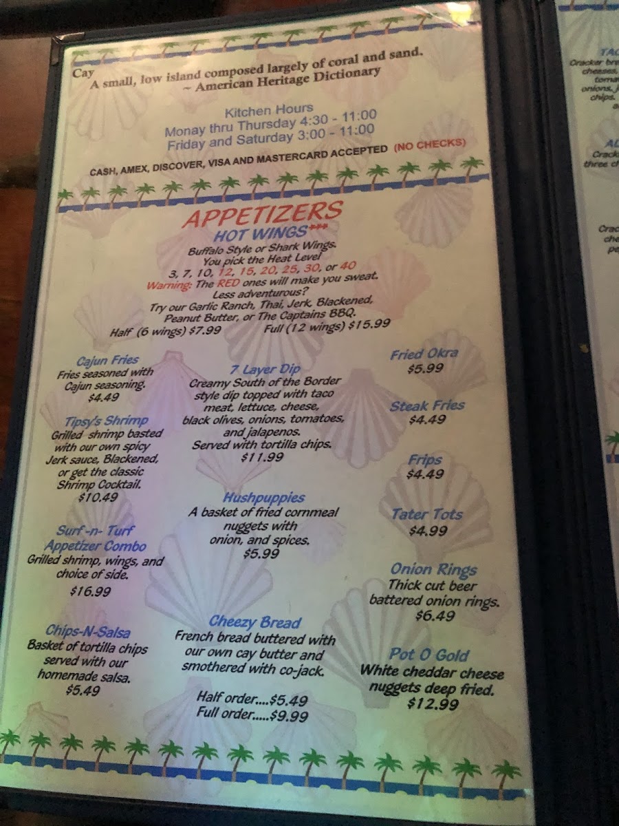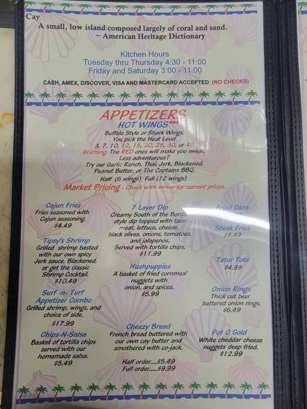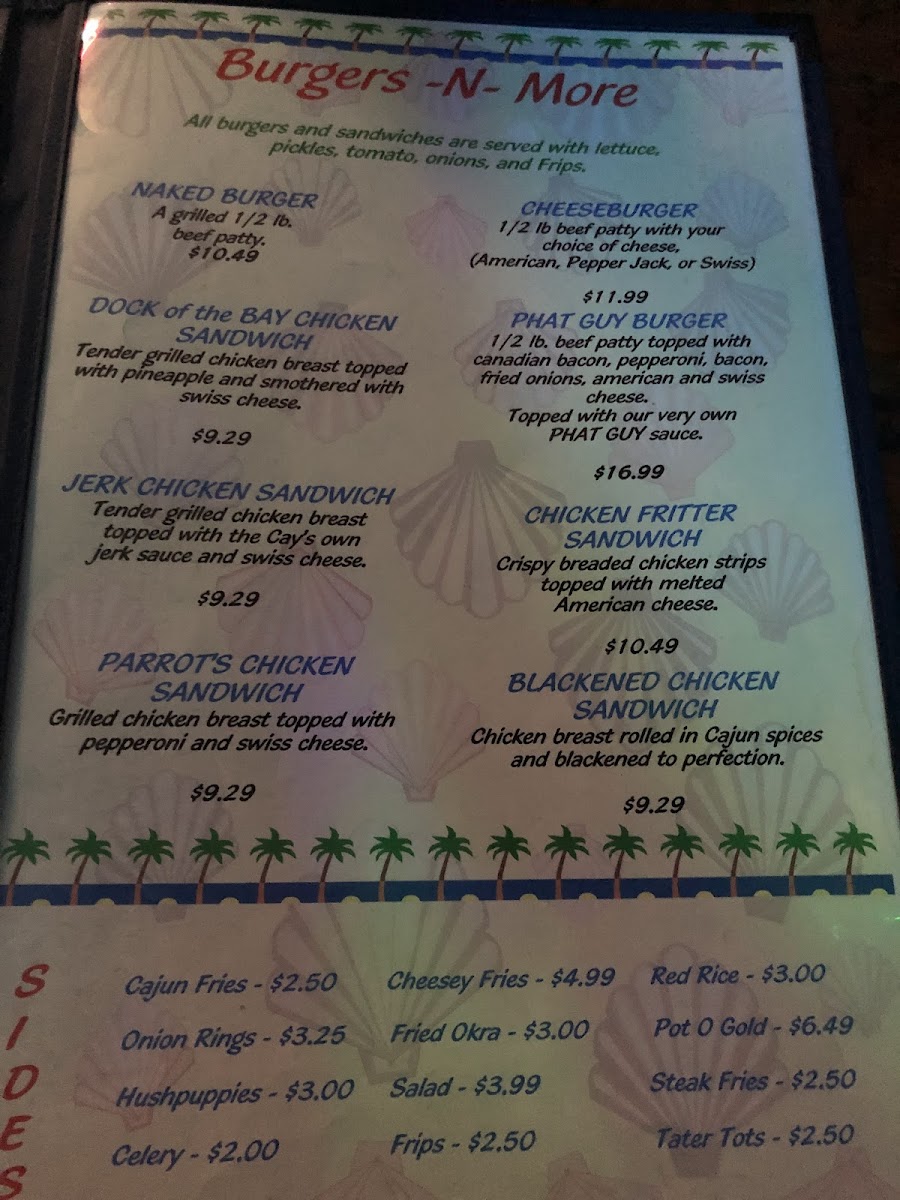 The menu at Parrot's Cay Tavern & Grill offers a straightforward, casual dining experience with a focus on comforting southern-inspired bar & grill favorites. Whether you're stopping by for a relaxing lunch, unwinding after work, or catching a game with friends, the selection fits well within the lively yet unpretentious atmosphere of this local spot.